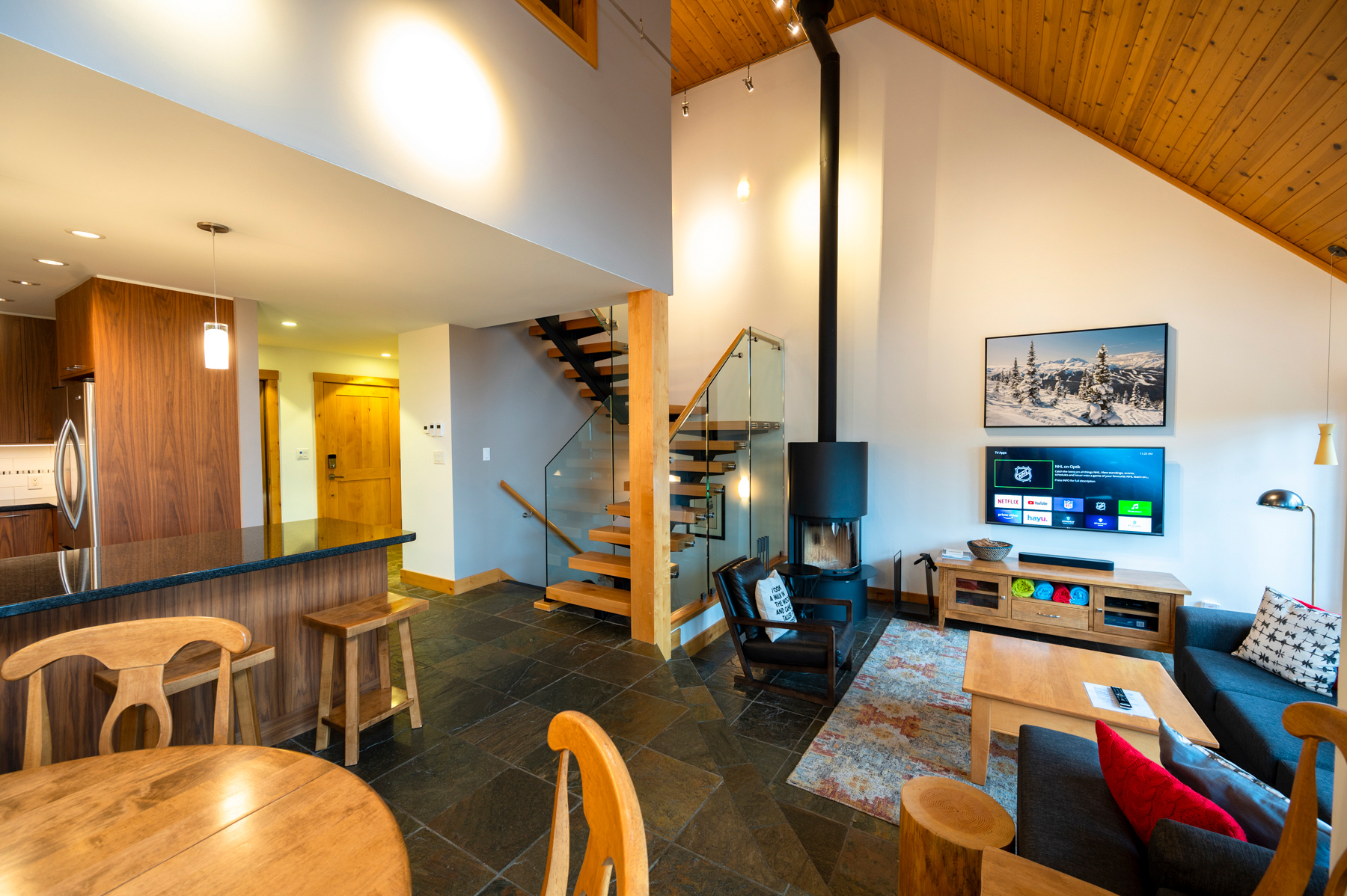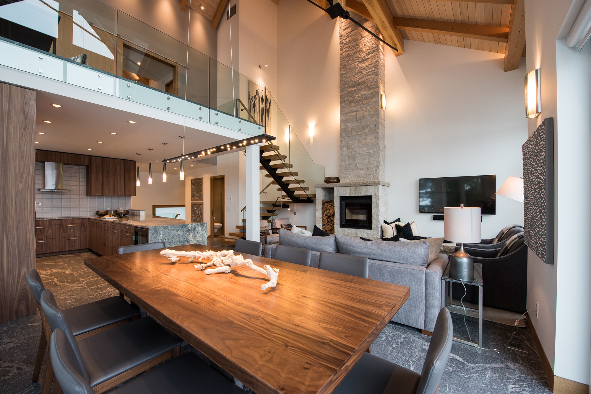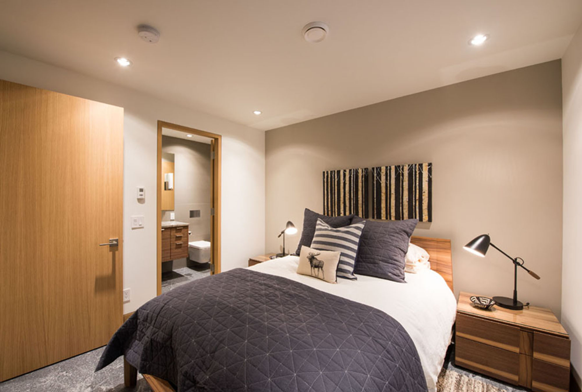 1 king bedroom ensuite, 1 queen bedroom ensuite, 1 queen bedroom and 1 bunk bedroom with 4 (FULL adult size) twin beds/2 sets of bunk beds. The latter 2 bedrooms share 2 more full bathrooms. This home was completely renovated with heated floors, towel warmers in bathrooms and brand new kitchen. We do NOT have AC.
